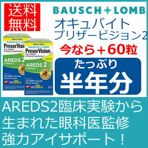 オキュバイト プリザービジョン2 大容量 180ソフトジェル×2個 商品名 Bausch and Lomb PreserVision Areds 2 内容量 180 ソフトジェル×2個 (6か月分) ご使用方法 栄養補助食品として、 朝食後に1粒と、夕食後に1粒の合計1日2粒を目安に、お水やお湯などでかまずにお飲みください。 ※薬を服用中あるいは通院中の方、妊娠・授乳中の方はかかりつけの医師にご相談の上、ご使用ください。 ※原材料をご参照の上、食品アレルギーのある方はご使用をお控えください。 ブランド BAUSCH+LOMB / ボシュロム社製 配達予定日 通常、発送後4?7日程でのお届けとなります。 成分 【1ソフトジェルあたり】 カロリー 10 総脂質 0.5g ビタミンC 500mg ビタミンE 400IU 亜鉛 80mg 銅 2mg ルテイン 10mg ゼアキサンチン 2mg 【原材料として】 ビタミンE含有植物油、食用植物油脂、酵母、デンプン、ビタミンC、グリセリン、 ゲル化剤(カラギナン)、ミツロウ、マリーゴールド色素、レシチン、香辛料抽出物、(原料の一部に大豆を含む) 広告文責 : 株式会社ArecareInc. 010-1-408-577-0907 生産国 : アメリカ| 区分 : 食品