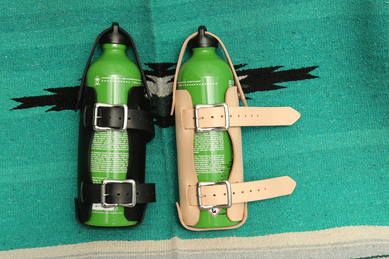 アルミ製のガソリン専用タンクにサドルレザー製のホルダーをつけ、フレーム等に簡単に固定できるようにしました。