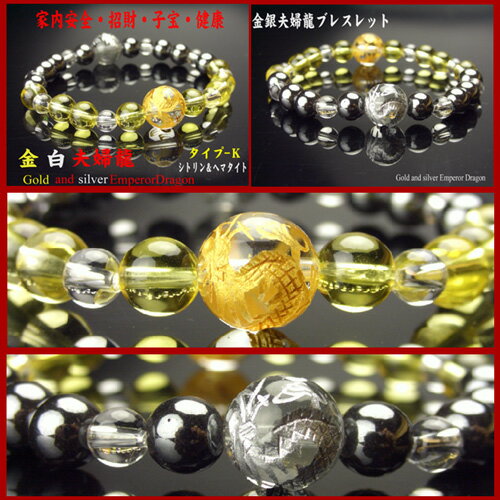 タイプ−K シトリン&ヘマタイト五本指の龍 金銀夫婦龍ブレスレット 上記選択欄より、ブレスレットのサイズをお選び下さい。